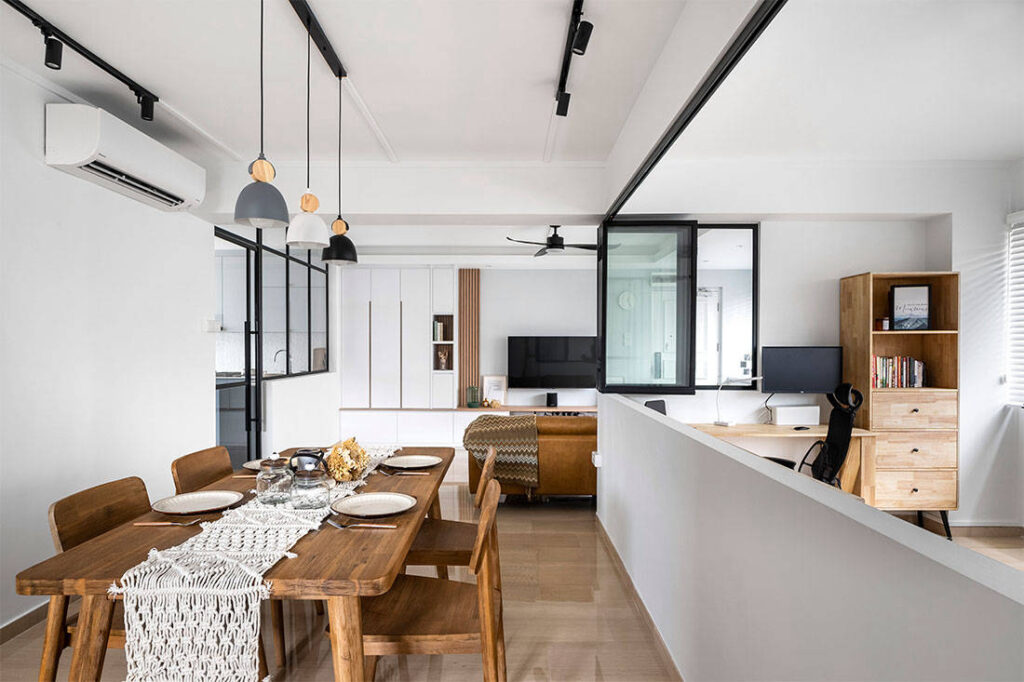 First off, the husband works from home, which made the presence of the existing study in this 5-room unit an ideal feature. But Chris has elevated the design further but inserting a long L-shaped window with a view out to the dining area and partially to the living room. This opens up the spaces dramatically and also allows natural light to penetrate more deeply and brighten the flat.