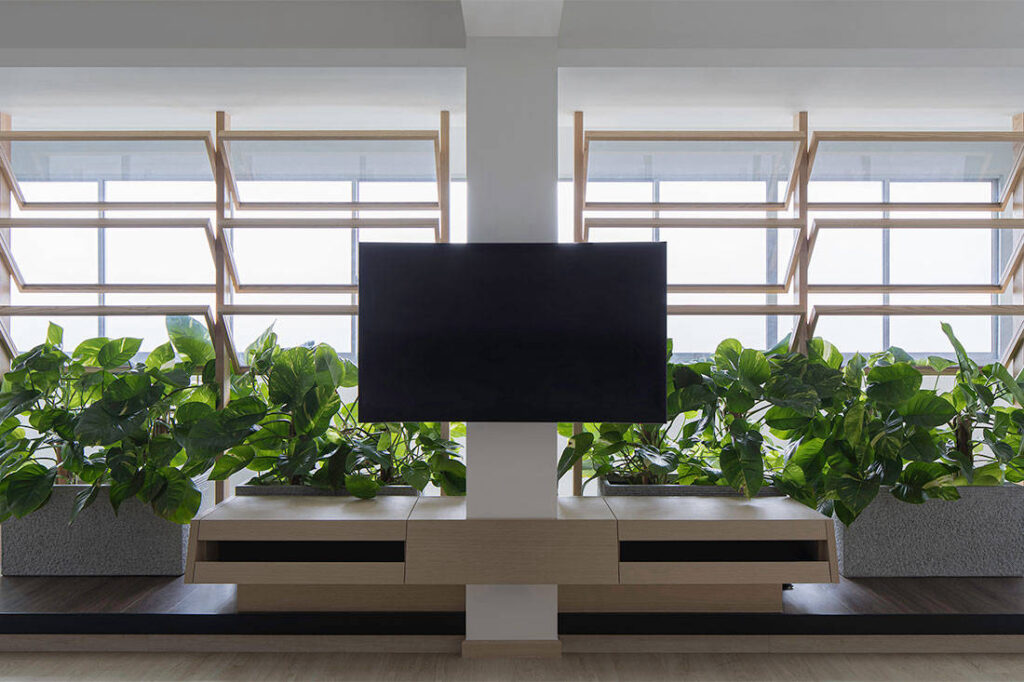 At the same time, this new configuration allows for the insertion of the home’s major feature – a ‘green corridor’ at the entrance comprising a row of louvre suncreens paired with planter boxes. “This design effectively ‘opens’ up the house and allows natural light to permeate the flat, as well as bring the dwellers closer to nature,” says Alex Liu, Right Angle Studio’s Design Director. In a duality of function, this feature also serves as a privacy screen, shielding off from view any activities that are going on beyond that point.