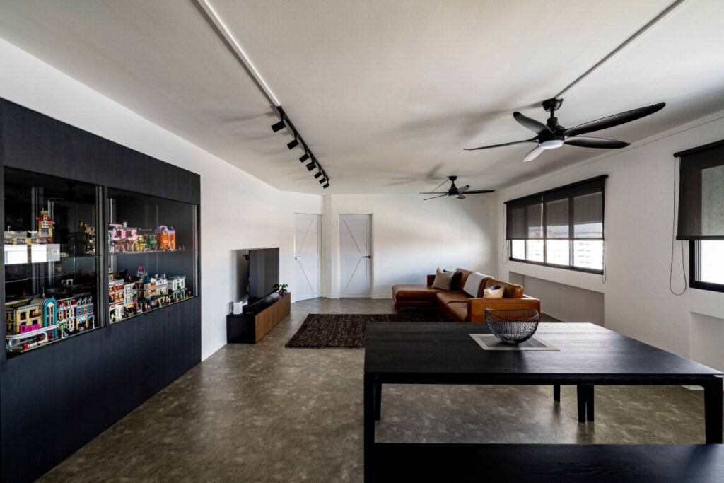 The female owner of this five-room flat in Pasir Ris lives here with her parents and pet dog. “The owner wanted a simple and modern home with plenty of space for her fur baby to run around and play. One of her hobbies was LEGO, so storage was important and she wanted a big display to showcase her collection,” say the designers from Swift Interior. Aside from LEGO, the owner loves Harry Potter and these details set a solid foundation for the design concept.
