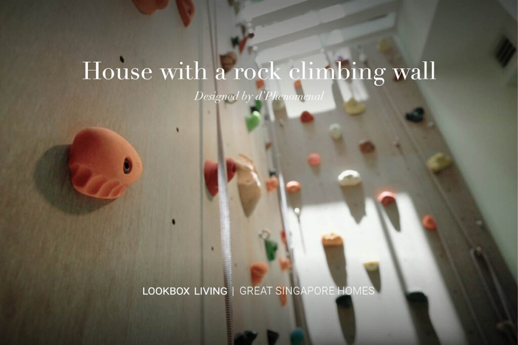 Designed by d’Phenomenal, this light-filled landed house comes with designated areas to indulge in a range of hobbies. The family of four living here can opt for quiet reading or scale a rock climbing wall whenever they please!