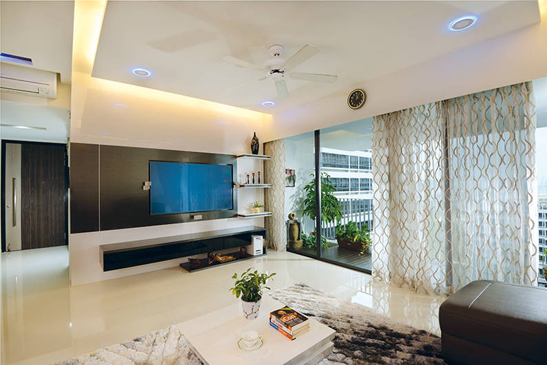 Sticking to an all-white interior is the most common way to make an apartment look clean and uncluttered. Customising an entire wall of storage also helps in maximising the limited floor space. In this case, the cabinets stretch from the main entrance, past the kitchen and into the living room. Cladding the storage in glossy white laminates is another design trick that helps to perpetuate the illusion of space.