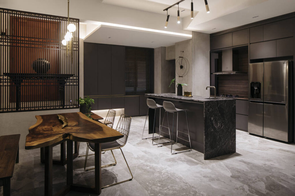 “The main structural challenge involved reconfiguring the layout between the main entrance, kitchen and utility room,” says Zoey, the lead designer of this remodel. We hacked away the old kitchen and utility room, and installed new plumbing work, electrical wiring as well as air-conditioning piping.” This made way for a more inviting, elevated entrance with concealed accent lighting that leads to an open-concept kitchen with an island-cum-breakfast counter, a dining area, and the rest of the home.