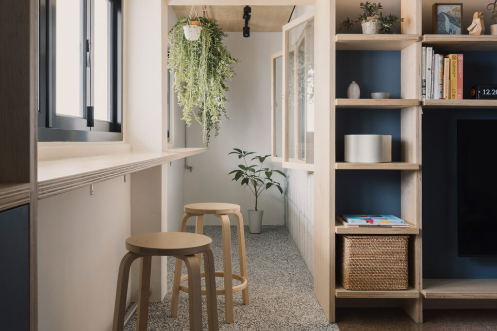 The old resale flat came with some lovely features that the designers decided to keep, including the original pink-hued granite flooring and the parquet floor in the bedroom which was refinished and given new life. The newly introduced material palette is decidedly raw (plywood and hollow bricks), bringing forth the sense of the natural, and being close to nature.