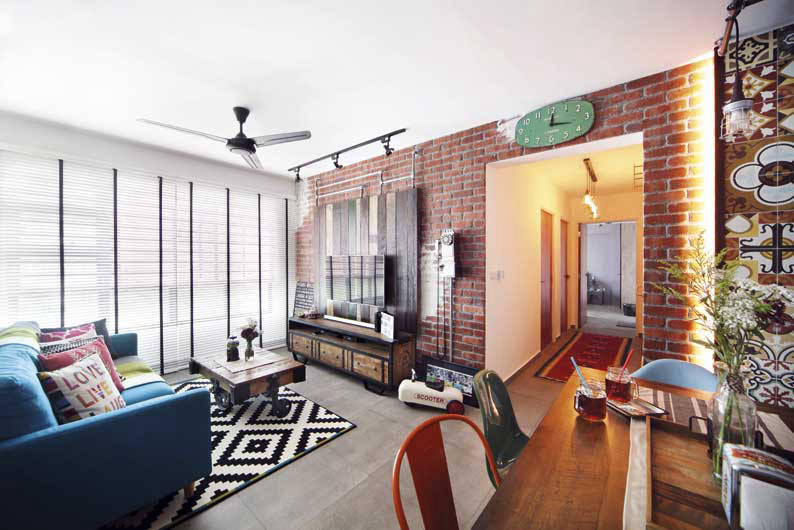 We love it when a home takes bold risks and the owners decide to do something different. In this 4-room HDB flat, the newlywed owners take a familiar interior design style and alters it to make it their own. The result? A nostalgia-driven “industrial kampong” home that exudes warmth and familiarity. Design firm Linear Space Concepts took the homeowners’ love for all things vintage and came up with a detailed design plan that embellishes the rustic industrialism of raw materials with ethnic influences and vintage-inspired accessories.