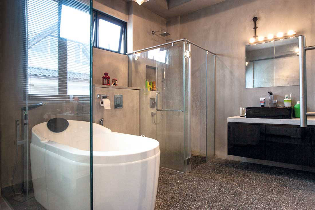 Even though the industrial look is maintained in the bathroom with concrete screed walls, the space is also fitted out with modern luxuries and enjoys plenty of natural light. Pebble wash flooring enhances the raw and rustic feel.