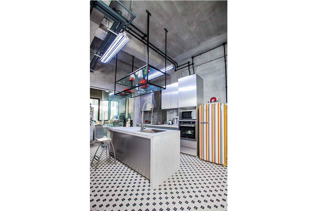 Although the industrial vibe continues in the kitchen, the mood in this space takes a more retro slant where grey tiles give way to black and white ceramic mosaic tiles that evoke a ‘70s nostalgic charm. A Smeg fridge in colourful stripes completes the retro aesthetic.