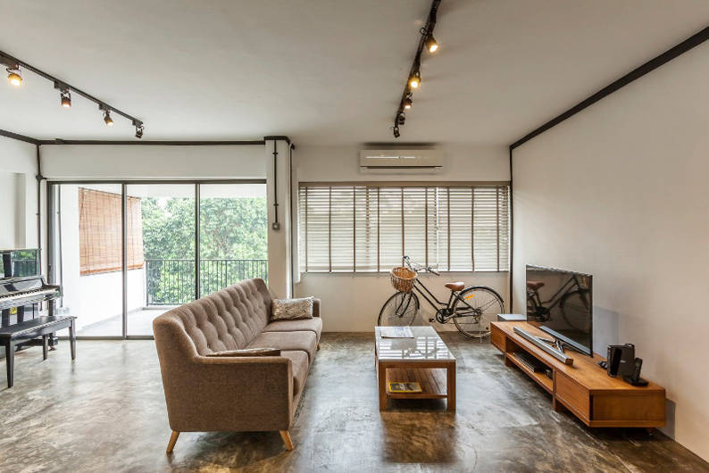 In this spacious apartment, interior design firm Meter Cube accentuated the space with an open plan layout. Cement screed finishing on the floor, black track lighting and black-painted electrical trunking bring about a raw industrial feel to the space.