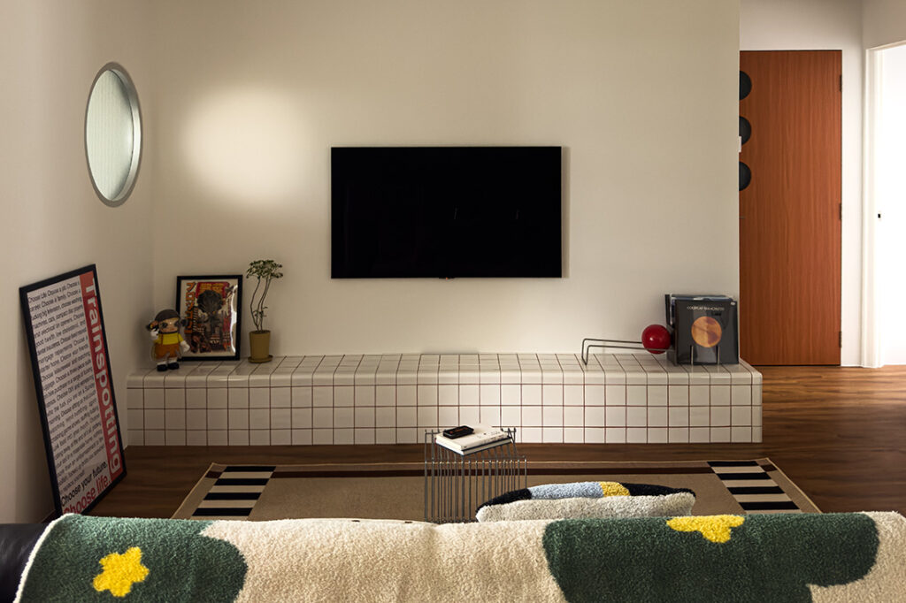 In the living area, a mosaic-tiled TV console runs long and low — a textured strip that doubles as display ledge and occasional perch when guests drop by. It sets the tone for a home that values craft as much as convenience, and it acknowledges the couple’s preference for tactile finishes over trend-chasing decor.