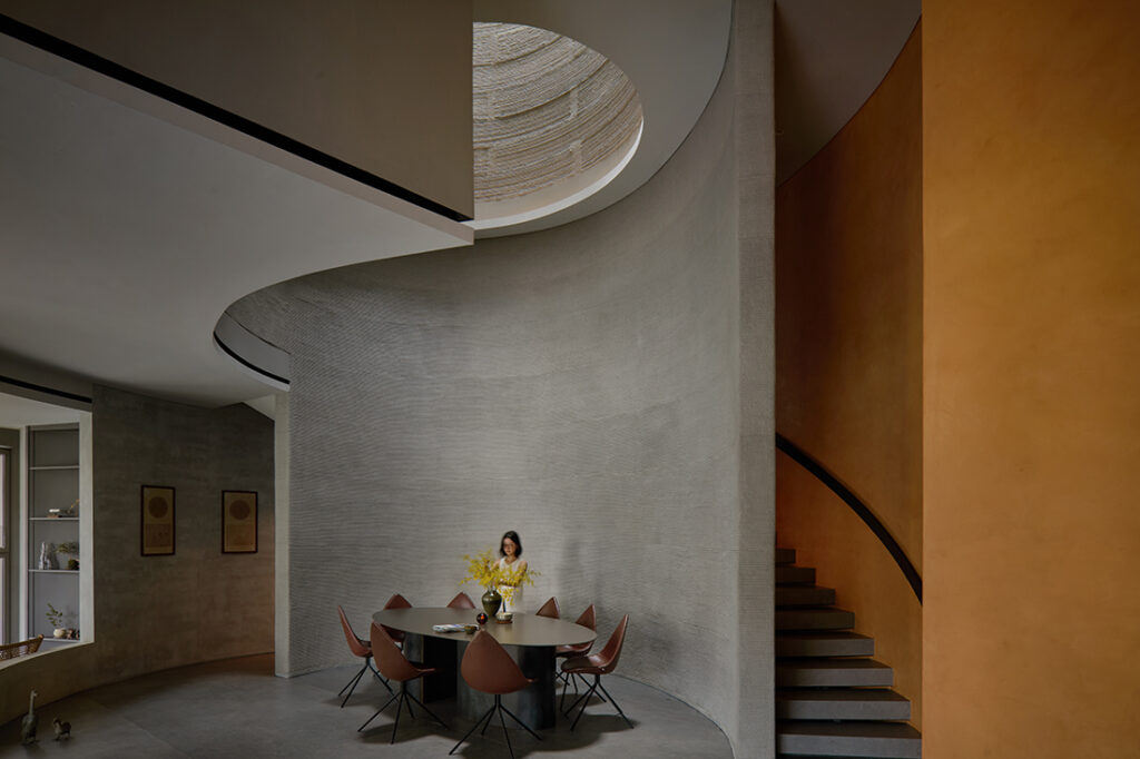 As one enters the house, the oculus – directly above the dining room – is the first key design element that will greet and wow you. It is anchored at the centre of the house, shaping the entrance experience on the first storey, and spatial journey on the upper storeys. The significance of the oculus relates to Lim’s memories of the old house, where it has a strong sense of geometric forms and formal spatial arrangement. On the upper storeys, spaces and rooms are organised around it. Its presence is experienced throughout the home as it leaves its ochre-stained slivers through the bedrooms and circulation spaces.
