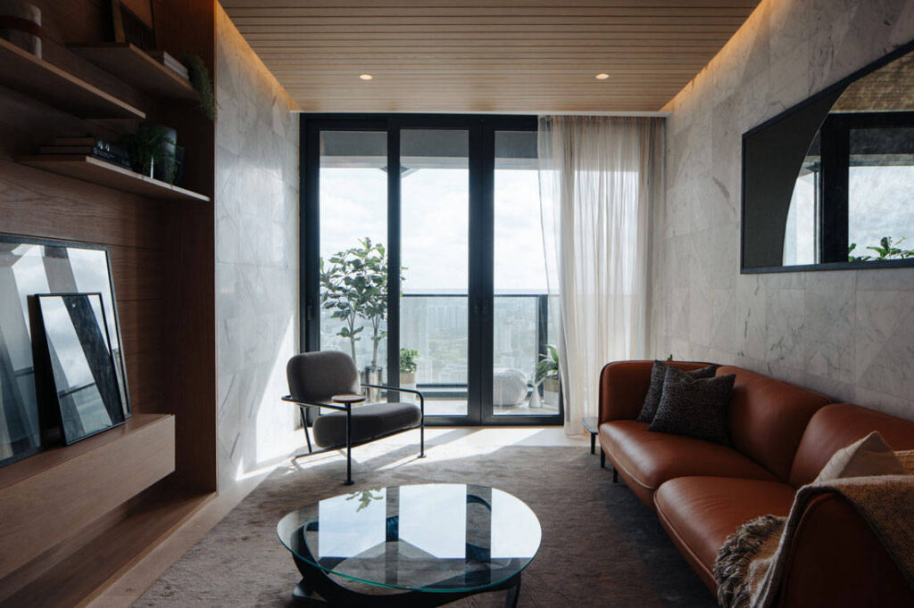 “The client wanted a design that could appeal to a more mature buyer group that is well travelled and has discerning taste. The user profile we envisioned was a couple in their late forties or early fifties with a young adult child in his or her early twenties,” shares Tan. His response is a tapestry of sophisticated materials, sweeping lines and geometric patterns.