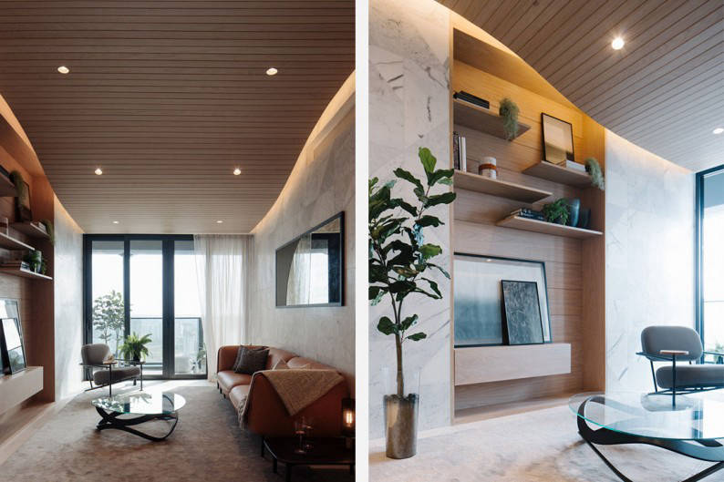 Breaking the rectilinear framework of the common spaces are a wave-like oak timber ceiling above the living room, echoed by a feature wall of curves that provides a cosy embrace at the dining area. This is set against a foil of white-and-grey geometric, marble-clad walls and cream-coloured marble flooring.