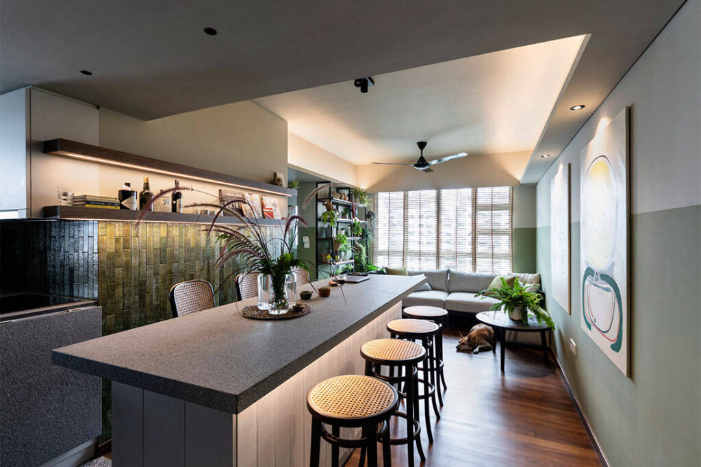 When it’s not used for meals, it is also a very conducive work space for all the work from home days where it doubles up as a 2.6-metre-long desk (equipped with powerpoints on three sides of the counter).