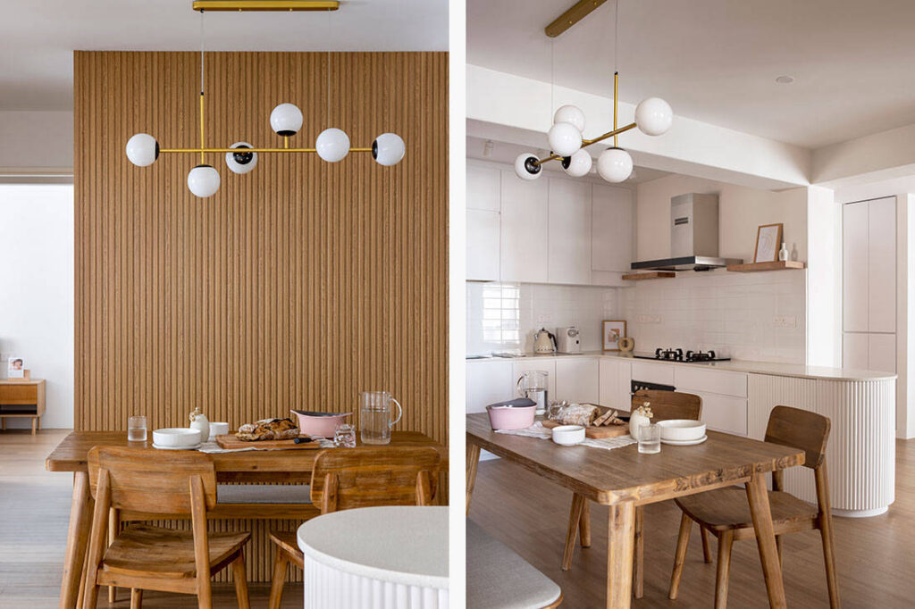 “We decided not to make any structural changes to the floorplan as our clients will be looking to upgrade their home in the next few years. Instead, we extended the kitchen counter into the living area in such a way that it serves as an ‘island’ of sorts. The edge was also curved so it wouldn’t jut out awkwardly,” say the designers.