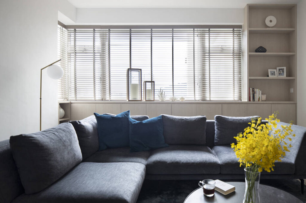 Opposite the feature wall is a built-in storage unit with a bookshelf, in a matching finish, occupying the space where a row of full-length windows once was. To accommodate more storage and abstain from cluttering the TV wall, Jimmy opted for half-height windows with a bottom panel of cabinets, offering additional tabletop space.