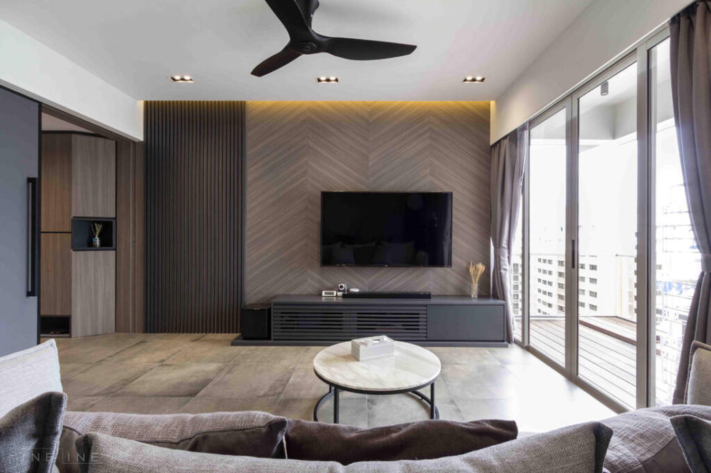 For this purpose, he focused on hardwearing materials like laminates and tiles. He also proposed a welcoming palette of browns, introducing them in a variety of patterns to add depth, dimension and visual variety to the space. For instance, the television feature wall features patterns that contrast yet work with the customised console. The concrete-looking floor tiles imbue texture and complement the colours in the living area.