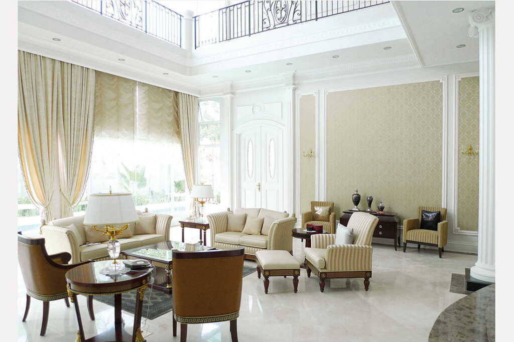 This 6-bedroom bungalow in Ipoh, Malaysia, is a study in restrained and controlled elegance. The Interior Library set out to emphasise the house’s contemporary vibe but at the same time, incorporate a healthy dose of European glamour. From the all-white interiors to the richly detailed wall mouldings, the design team struck a fine balance between the modern and the opulent.