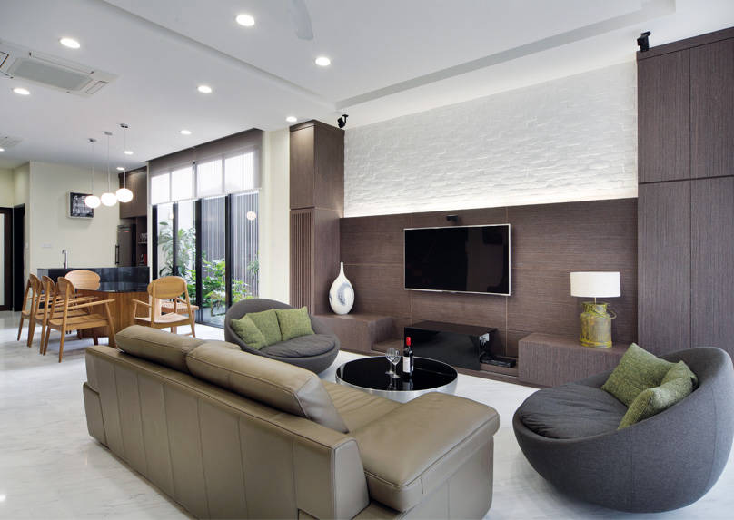 Not many homes can pull off a look that is grand yet homely. This landed house however, manages to pull it off with panache. The luxurious space is characterised by an earthy colour palette, smart furniture choices and carefully-planned living spaces. Marble floors run throughout the entire first floor, complementing the cosiness with a cool ambience. The living quarters, living room, dining room and dry kitchen – are connected in an open-concept layout that contributes to the sense of airy openness.