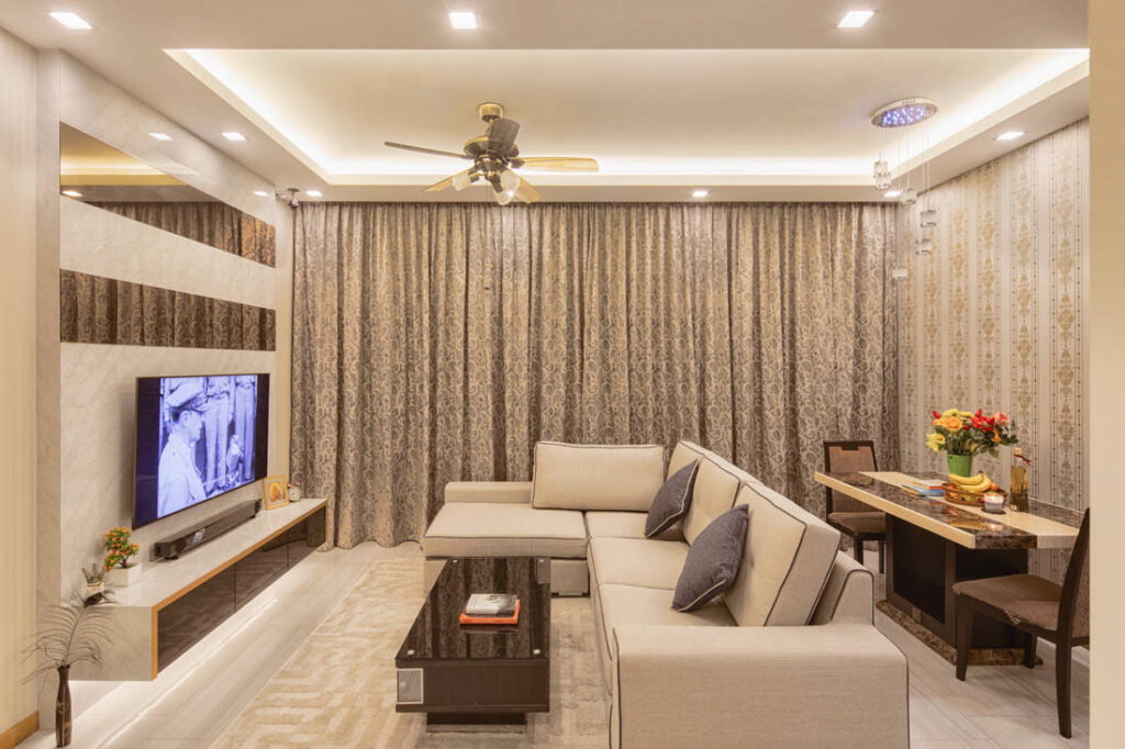 Making a clean-lined impression, the material palette in the foyer comprises of pristine white laminates outlined by gold-brushed laminate trimmings. Marble-effect laminate backings and striped wallpaper ensure design consistency and imbue opulent textures into the space. Says Aaron: “I like how the entrance walkway turned out. It has been specially catered to host the Buddha portrait and it has turned out to be very welcoming, together with the spotlights and lightly-patterned striped wallpaper.”
