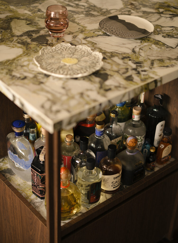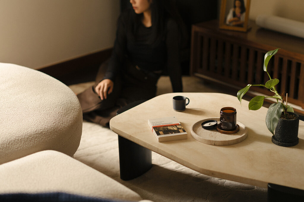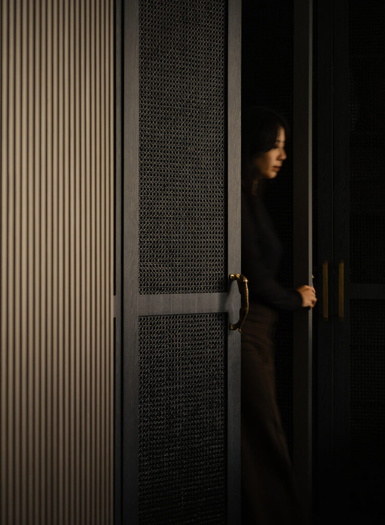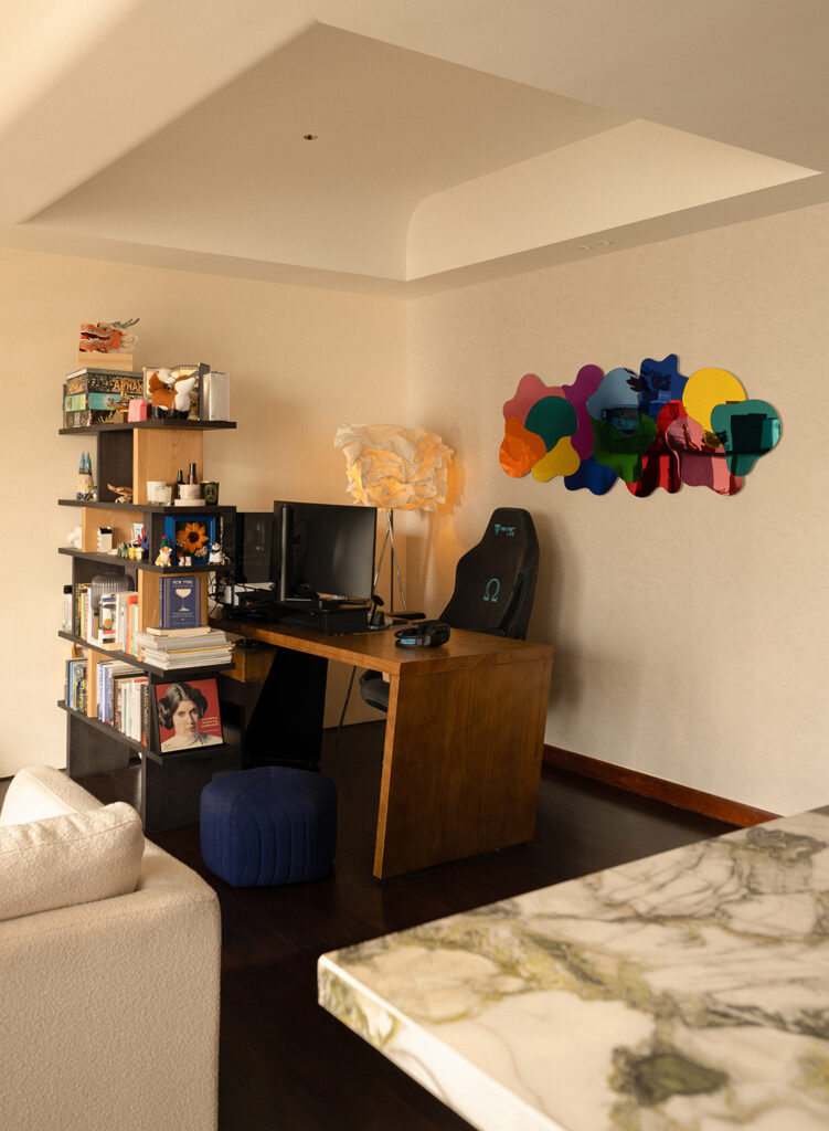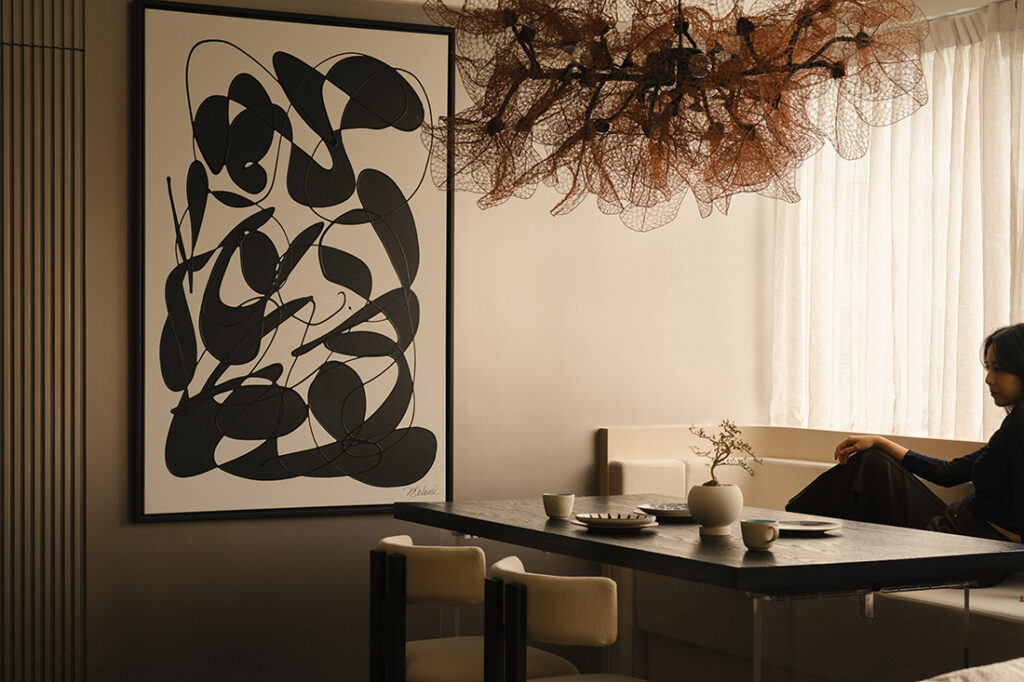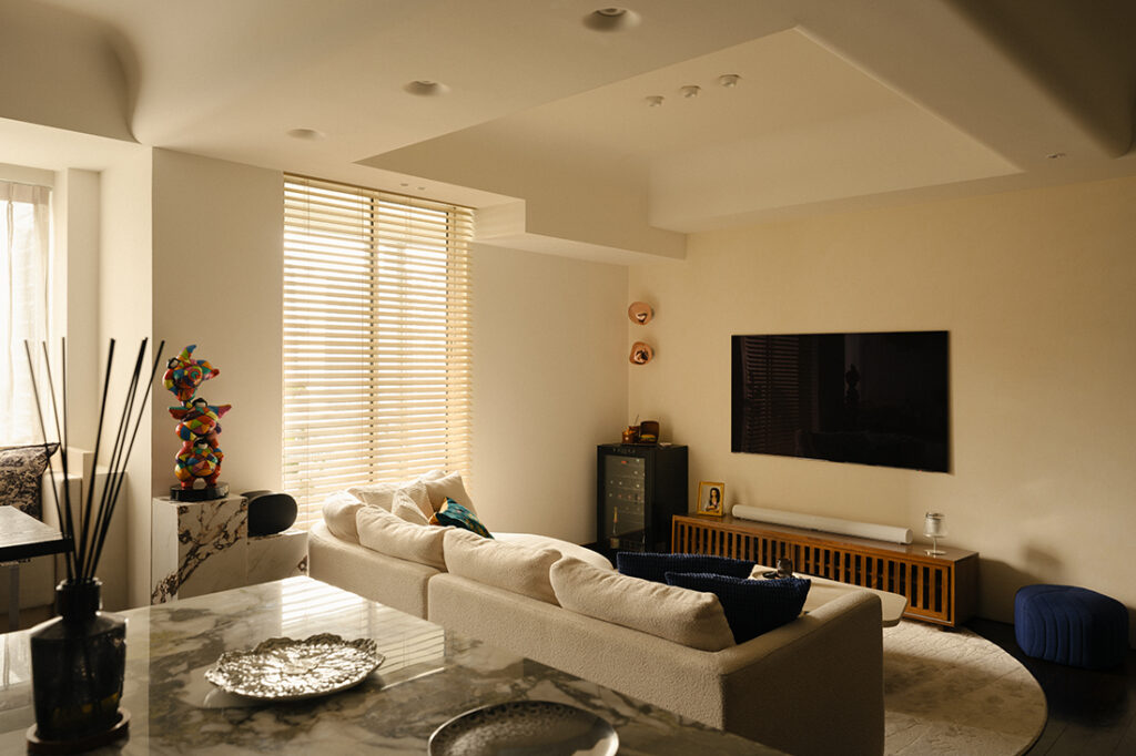 Lighting is where the project becomes particularly attuned to the couple’s routines. During the day, the apartment leans on natural light filtered through sheer curtains and blinds, moderating the brightness from outside. By evening, layered lighting takes over — cove glows and low-level accents gradually shifting the mood into something more intimate and conducive to lingering.
