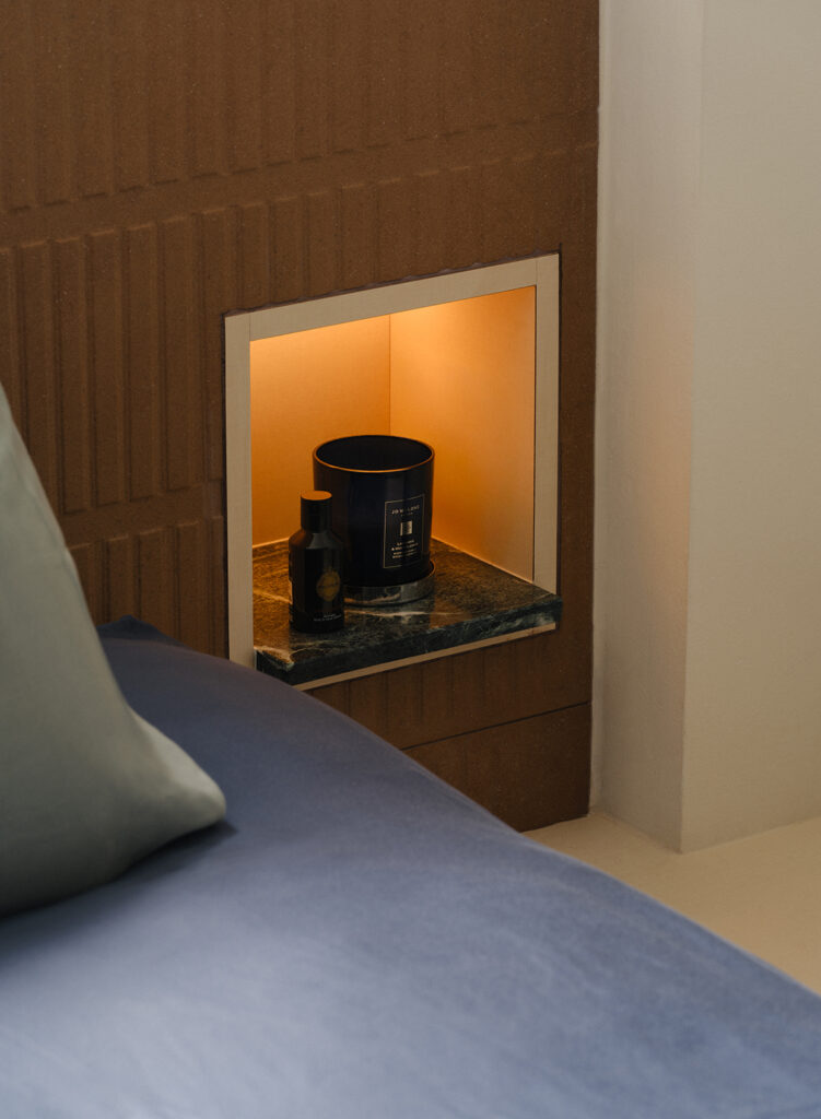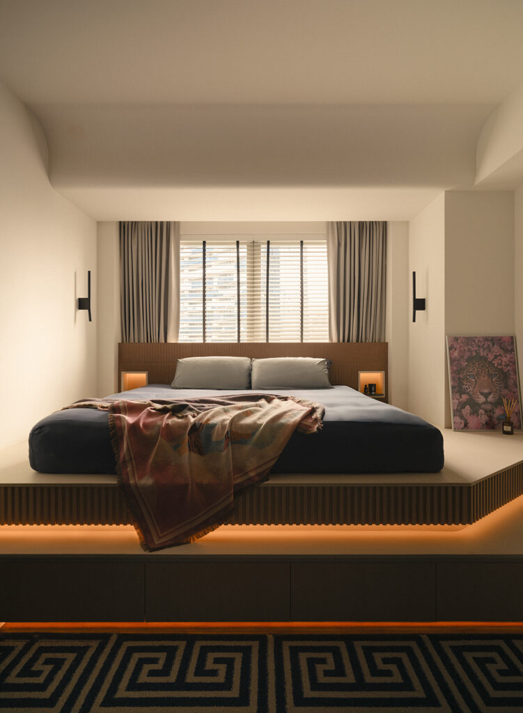 The bedroom, in contrast, pulls back. Tucked away from the main space, it adopts a more restrained palette. The bed sits on a raised, angled platform and bedside niches neatly serve as side tables. After the energy of the living areas, it reads as a necessary counterbalance — a place to retreat without competing for attention.
