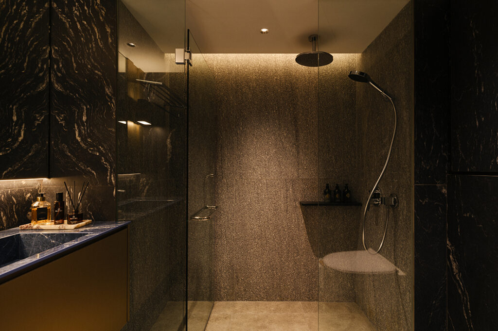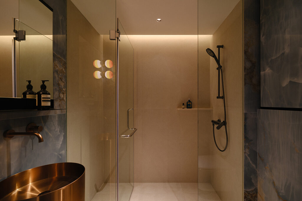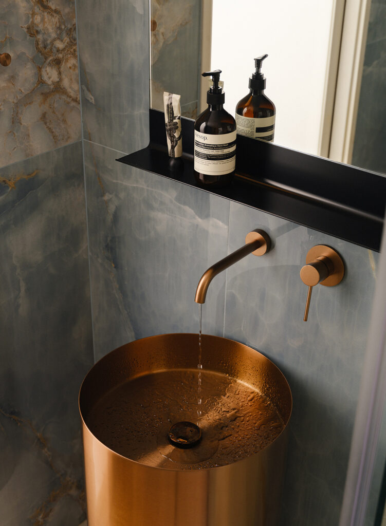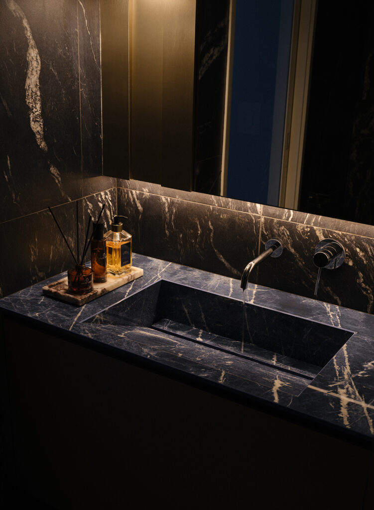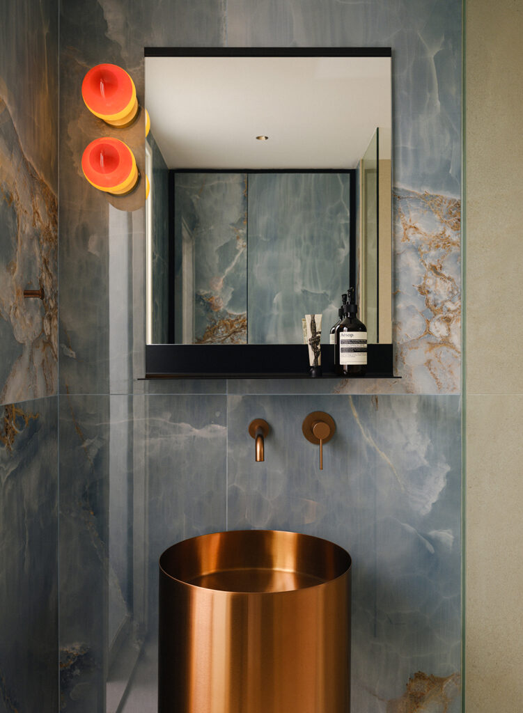 Material choices reinforce this reading. Stone surfaces, warm timber, and darker flooring ground the space, while sculptural elements — like the pendant lamp above the dining table or the copper cylindrical basin against bold stone patterns in the guest bathroom — introduce moments of character without making the space feel busy. Storage is designed to recede, allowing the visual field to stay composed even when the home is in full use.
