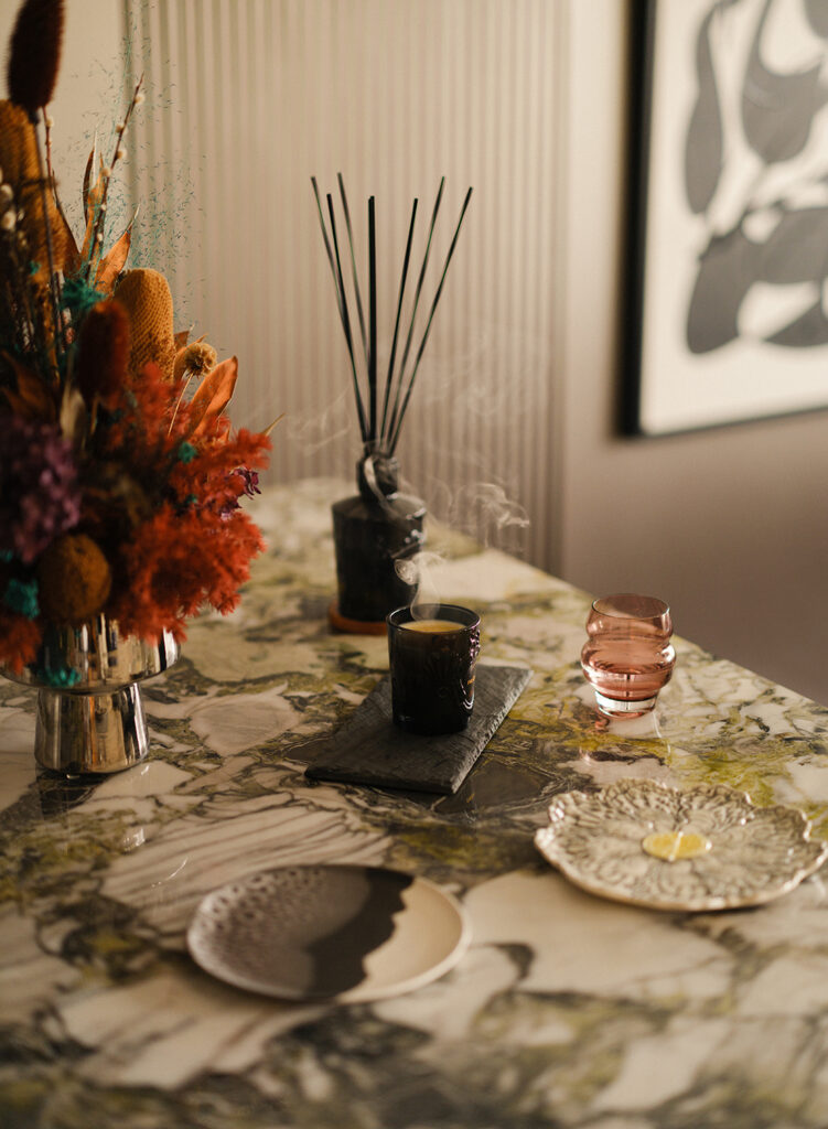 Rather than relying on walls, the space is organised through furniture placement and atmosphere. A low-slung seating area anchors the living zone, while the dining table sits centrally, acting less as a formal setting and more as a point of convergence — where meals, drinks and conversation blur into one.