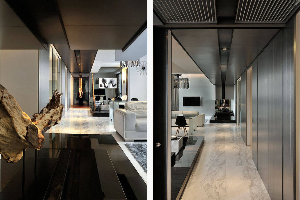 “The owners found their previous apartment to be too woody and wanted an absolute change with their new home. ‘Modern luxury’, ‘industrial’ and ‘smart storage’ were also all included in their brief,” shares Stephen Goh of Metaphor Studio.