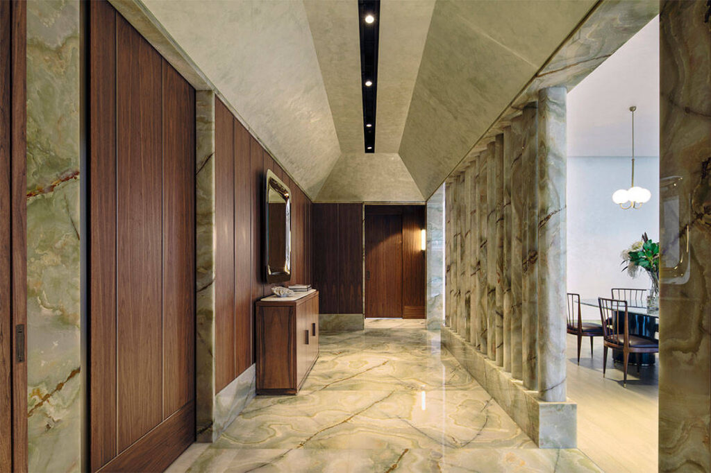The result matches the thoroughness in thought. The foyer’s green onyx surfaces pays homage to the condominium’s location near the Singapore Botanic Gardens, as well as the vantage from the nine-metre-long balcony into the estate’s lush central courtyard. It also complements the pastel-green Venetian plaster stucco that colours the canopy ceiling’s pyramidal form. Onyx engages well with light, of which there is plenty here. To add to the dramatic act, Cheng shaped the wall between the foyer and dining area into a luminous colonnade.