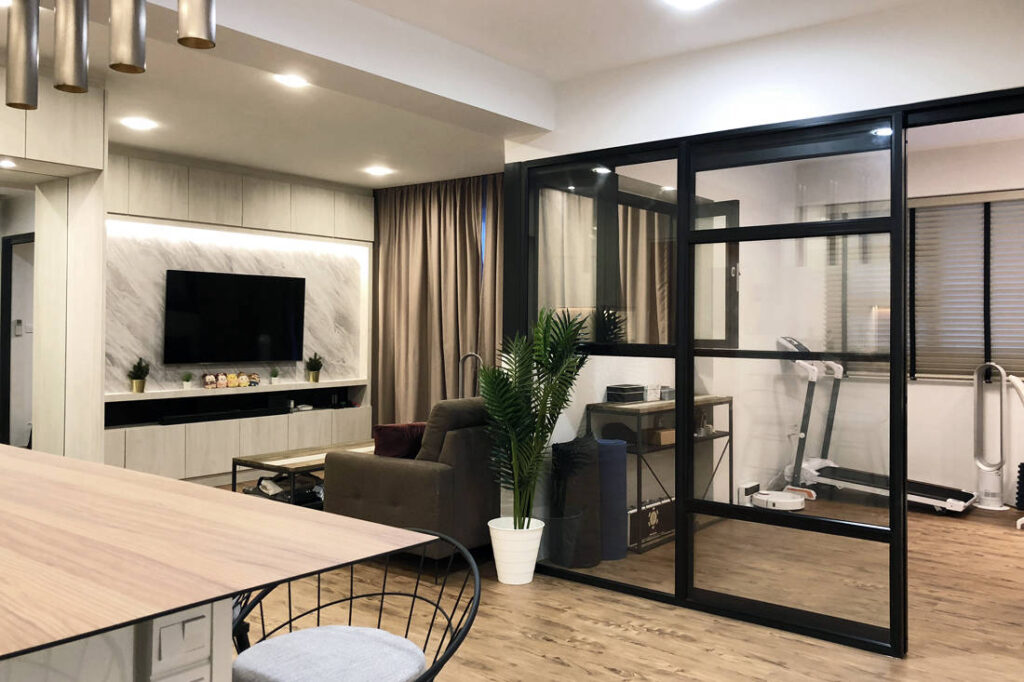 The expanse of this regular four-room BTO flat is immediately apparent upon entering the space where a free-flowing floor plan was introduced by interior designer Angeline Chua from Nest Spatial Design. She says: “We hacked away a common bedroom to expand the living area.” The homeowners, a married couple, also wanted a study and home gym. The room was later converted to accommodate their request and it is now enclosed with a black lattice aluminium frame with glass panels for a spacious and loft-like aesthetic.