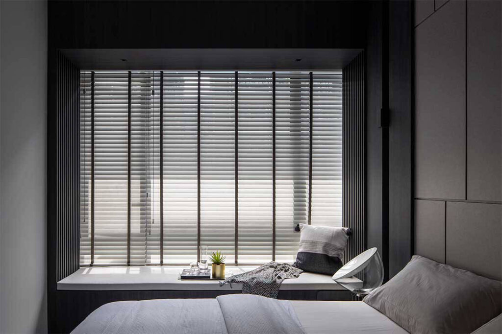 The monochrome theme continues in the apartment’s private zones. In the master bedroom, a built-in space-efficient settee transforms the bay window into a functional resting nook for quiet contemplation.