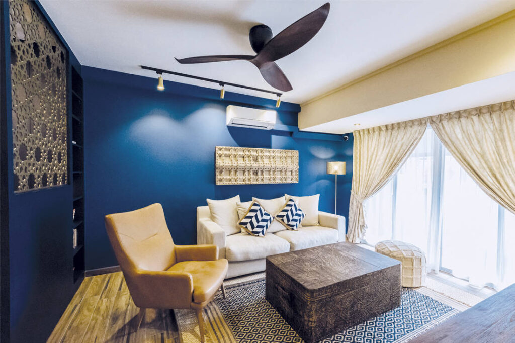 Home to a family of three, this two-storey executive maisonette by Fatema Design Studio pairs Moroccan and Islamic design elements with a more contemporary setting. By taking on a more modernistic approach, the design team afforded this home with a timeless appeal. This was also achieved by intermingling contrasting colours of gold and blue, forming a regal, yet playful setting.
