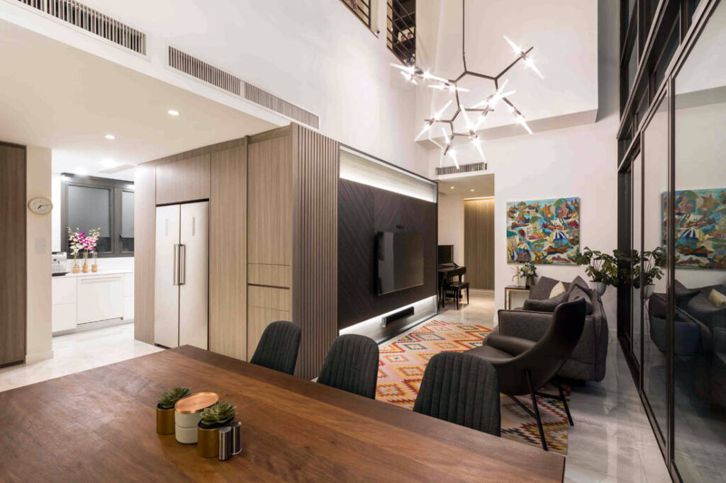One of the design highlights of the apartment is its double volume ceiling at the shared living and dining zones. Serene spared no expense in playing up the visual height. She shares: “We put up a six-metre stucco feature wall that fully maximises the lofty wall area at the dining zone and accentuated it with two modern glass chandeliers.” They also pair well with the other TV feature wall that sports chevron design details and warm LED lighting.