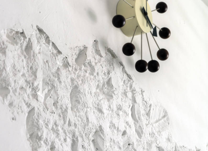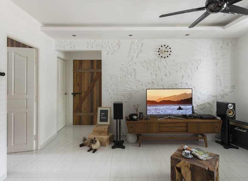 The HDB flat is a clean, white shell bursting with textures and custom designs. For example, instead of a bulky, space-hogging feature wall, Marc left the space pristine and fuss-free. The wall behind the television set has been given a special treatment that gives it a deconstructed look. By using power tools, the designer drilled and hacked holes into the wall to give it a shattered look, as if it had “gone through a war”. Other customised designs in this home include the shoe cabinet (which looks like abandoned wooden crates) and the strings of hanging lights over the dining table.
