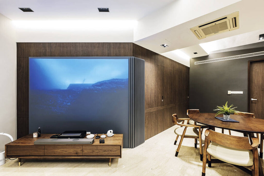 “The original space had a lot of awkward corners as the previous television area was too near to the dining space, which made the space not very functional,” say the designers who created a feature panel that functions as a projector wall for the tech-savvy family. A round dining table adds soft curves and provides more seating while taking up less space.