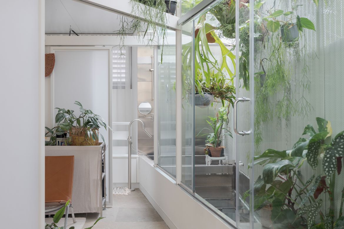 On the third floor, a glazed diagonal wall cuts the corner to create an outdoor space and view of the treetops. Lining this outdoor wedge is a massive single piece of moulded steel that acts as both a waterproofing membrane and bath (a huge hole was cut through two floors to manoeuvre it into place). Designed as a series of pockets that can be filled or drained, the space is loosely planted with species that stretch out. This is true of the entire house, which has mesh placed to allow the great many plants their natural phototropism.