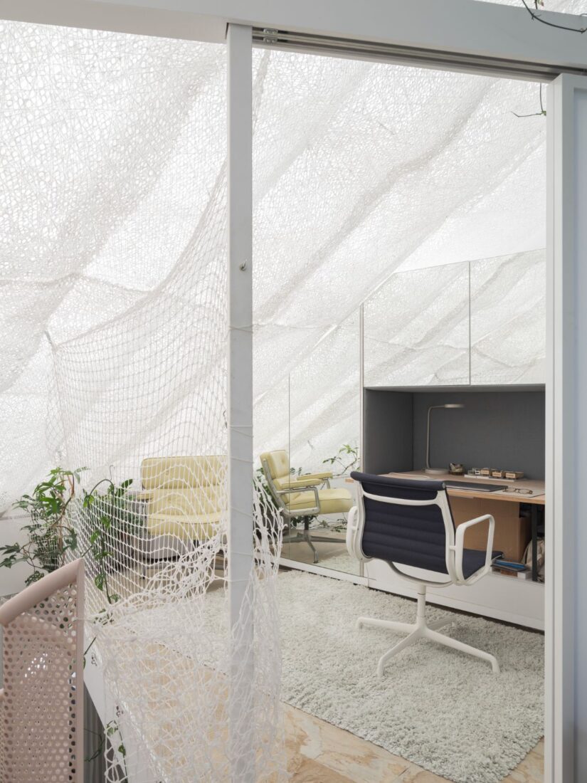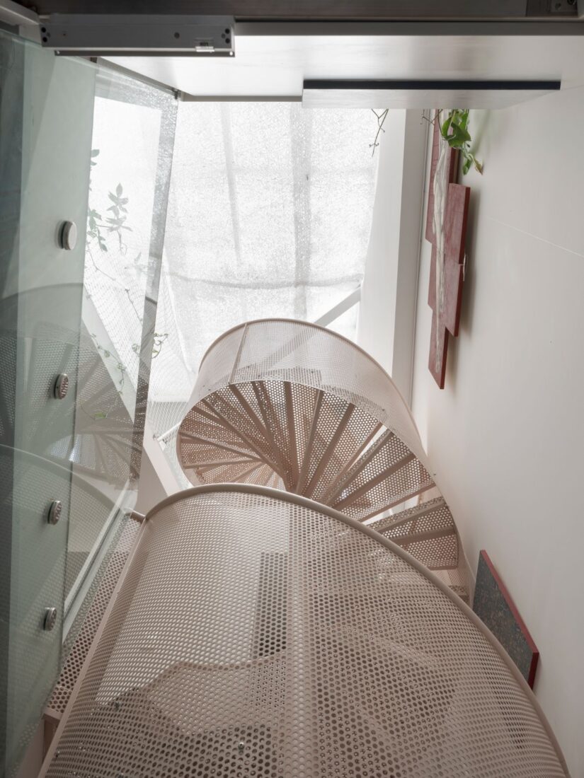 Despite containing three storeys, the house is small at 48 square metres, with no light from the rear or sides. Opening the whole from top to bottom, Shih has placed a lightwell at the rear, and a spiral staircase at the front, which culminates below a large, angled skylight shrouded in layers of artisan washi paper with irregular holes. The light from this massive (relative to the house) skylight flows through the house to the ground floor, where a glass wall separating the work and home entry points allows the light to fill the studio space. “The translucent and transparent layers upon layers are trying to create a mental distance that is not physical between inside the house and the actual street, so it can be manipulated, you can open it up to feel more connected, or close all of them to feel more separated, but without completely shutting it out,” says Shih.