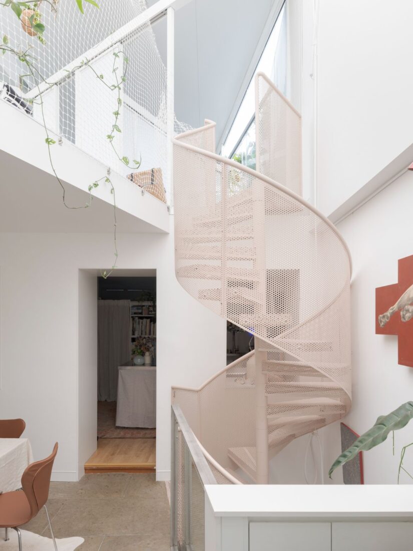 There is something visually exciting in the mutability of the home in terms of potential, but also in its immediate playfulness. The pale pink spiral staircase, for example, is deliberately “quite quick and quite cute”, while the washi paper is loved for its quirks and inconsistencies. Named Ima, which is both now and living room in Japanese, it is also very much the noisy party that allows the shy to be alone but engaged, connected but protected.