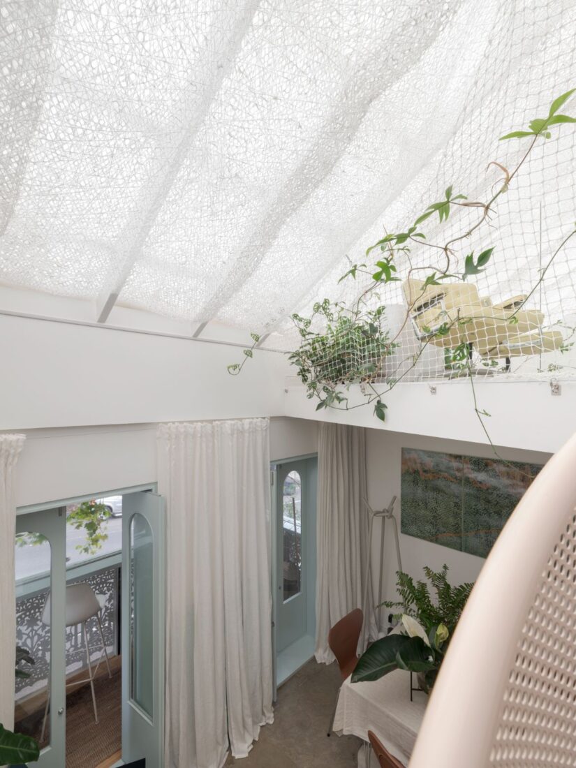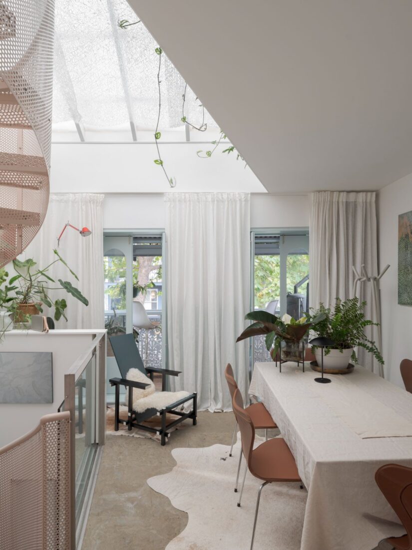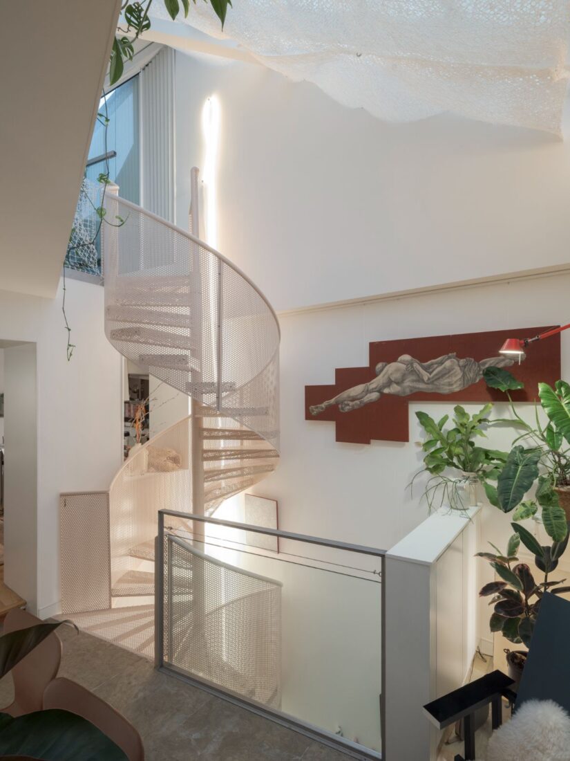 This open-perspective driven arrangement continues to the central living floor where the rooms flow continuously and without rigid designation. As Shih explains, how she and her new partner live in the space is determined by mood. “We are like nomads inside the house and have lived on every floor already. If we feel like we’re going to live on the top floor tonight, then we move upstairs. So different spaces can become bedrooms and can become workspace and can become a practice room. Currently, the ground floor is my art studio and my partner’s music room.” Keeping the space open but contained, curtains rather than walls conceal utilities and bring with them a visual and tactile engagement that reinforces the idea of the nomad.
