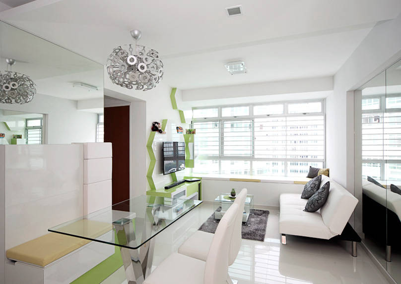 Small HDB apartments can have the tendency to feel crammed and claustrophobic, which is why the designers at Plush Living wanted to open up this petite space. Light, neutral shades colour the walls and furniture, while glassy surfaces and opaque materials lend to the illusion of spaciousness. To up the design factor, angular lines and geometric shapes play prominent roles in this home. Also apparent is the lime green accent colour, adding a burst of life into the otherwise overpoweringly white rooms.