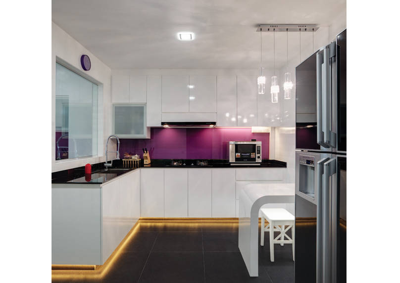 The large foyer incorporates mirrored panels and glossy finishes over the shoe cabinets and other storage spaces. There is also a light feature overhead, which throws a soft glow onto the area while creating the illusion of space with its reflective surfaces. Another example of the use of optical illusions in this executive apartment, is the floor-to-ceiling tinted mirror in the dining area and unfussy lines that dominate in the kitchen.