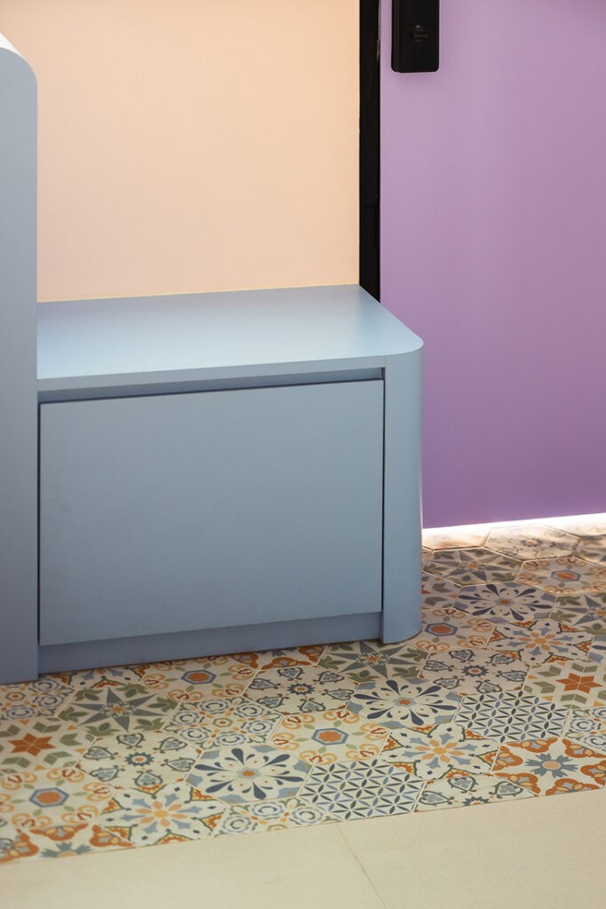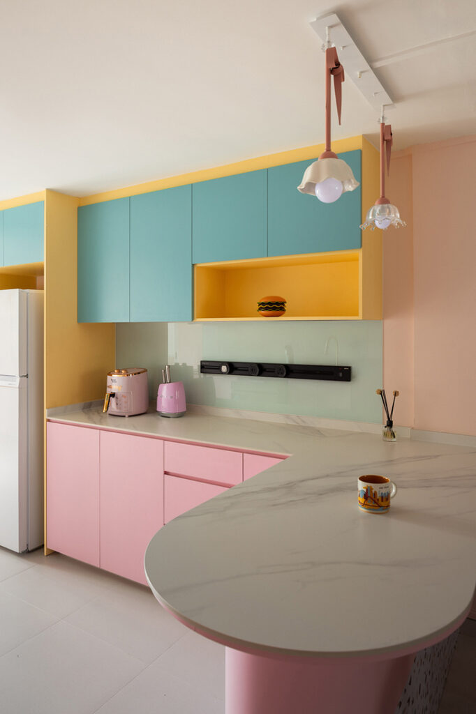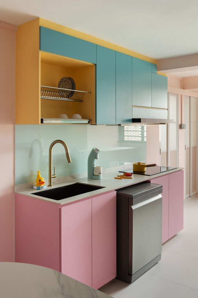 Within the kitchen, cabinetry in bright pastel tones introduces a cheerful character without overwhelming the compact footprint. The colour blocking strengthens continuity with the adjoining communal space while reinforcing the home’s playful retro-modern palette.