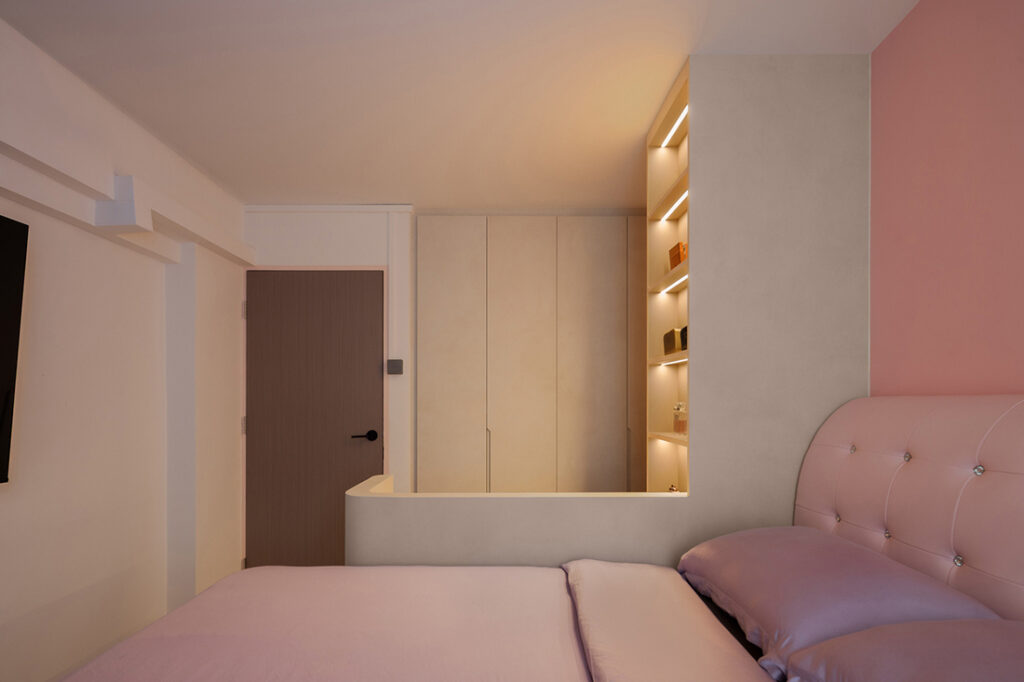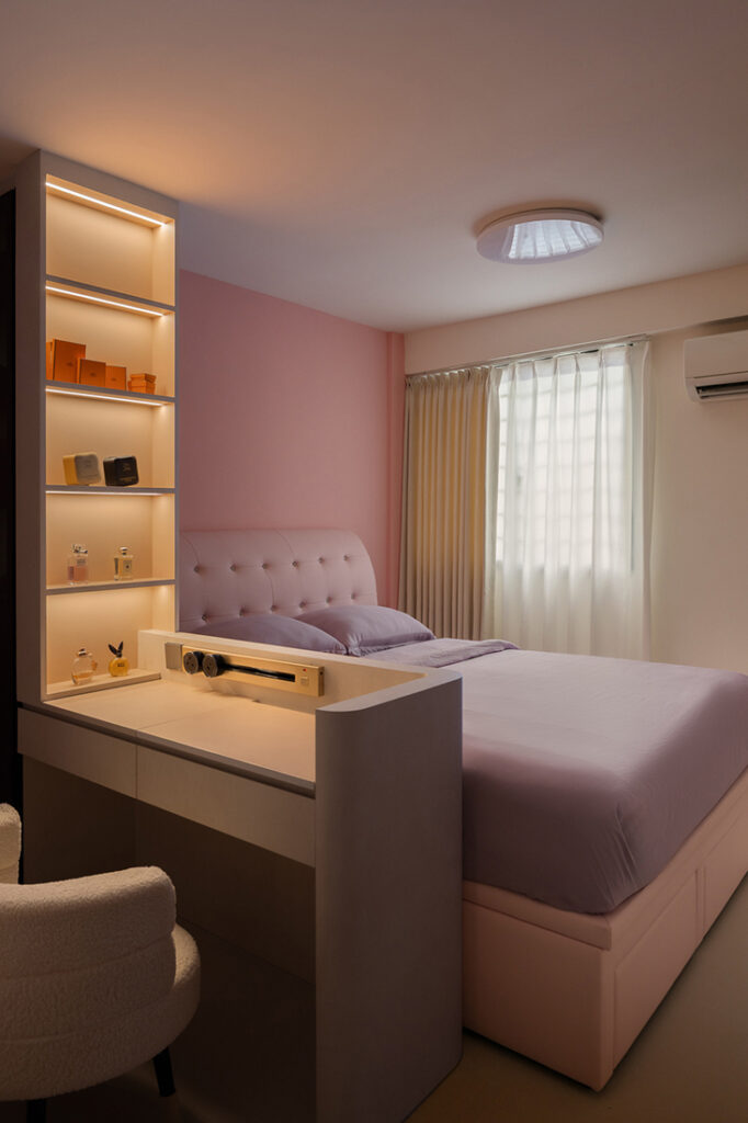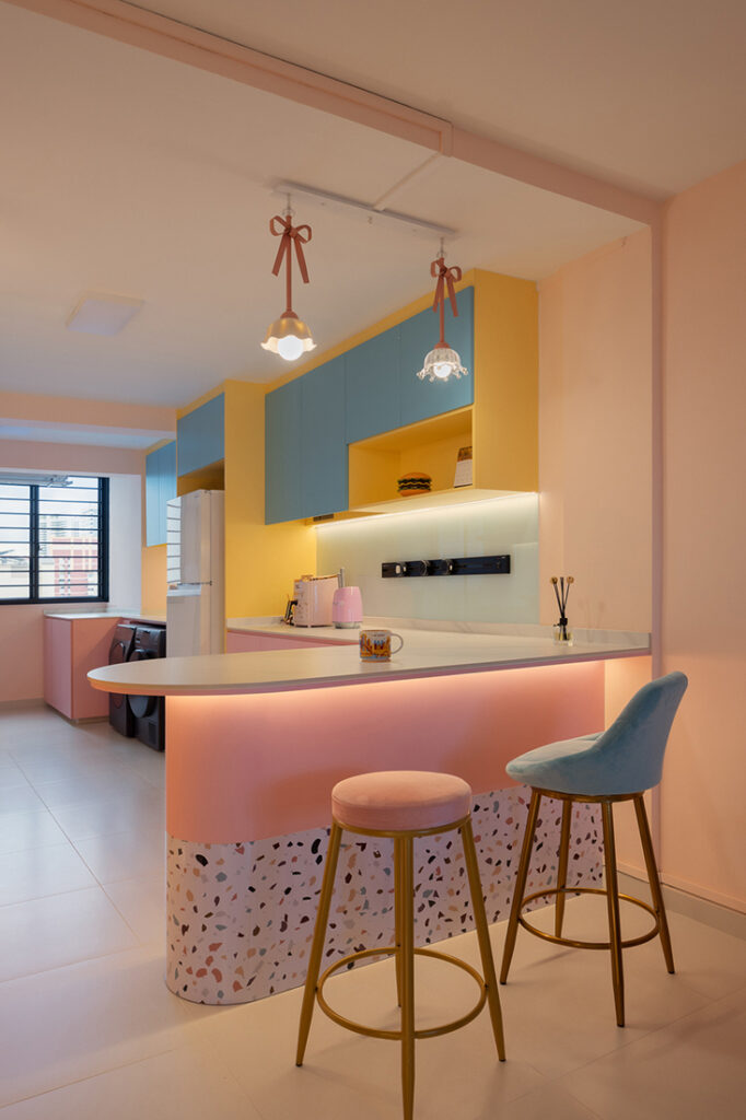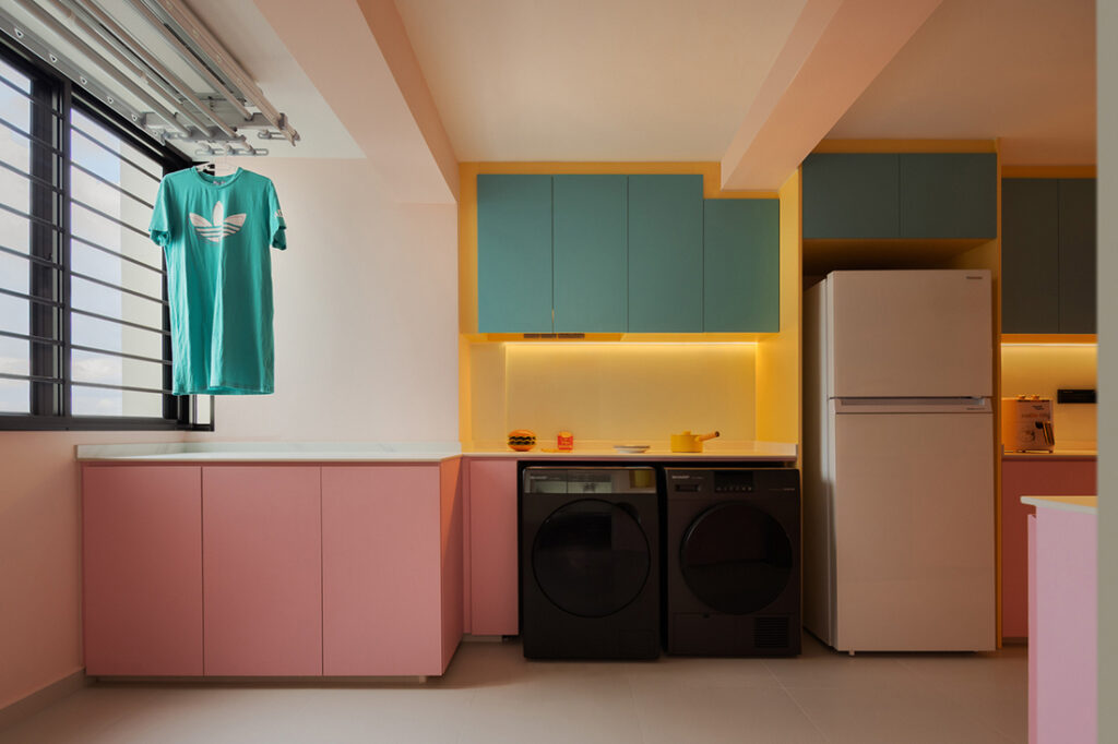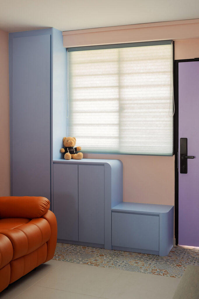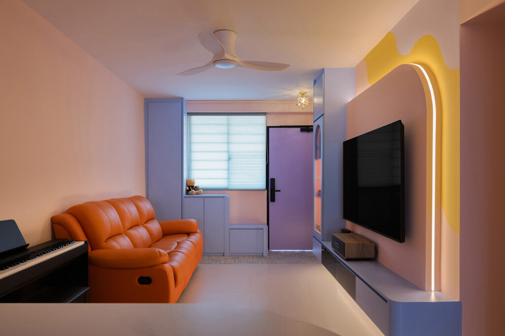 Who says older flats cannot feel joyful and full of character? Located within the mature Toa Payoh estate, this three-room resale flat was refreshed by designer Kasey Wong of Reborn Interior with a lively pastel palette inspired by the homeowner’s brief for vibrant hues with a hint of retro charm. Soft colours and gentle curves draw out a characterful interior that balances everyday ease for a family of four with three children.