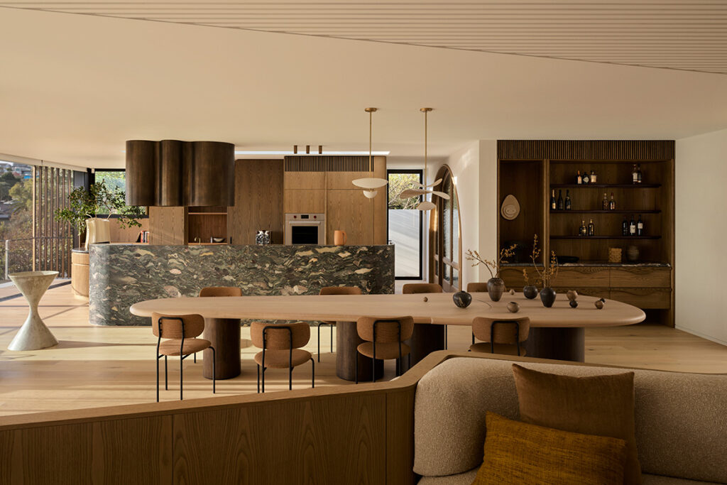 At the heart of the home is a striking central cupola: a double-height circular volume animated by shifting natural light. Acting as the home’s main axis, it anchors movement between the surrounding library, living spaces and a sweeping stair that connects all levels. Nearby, a sculptural 20-seat dining table sits alongside an oak-lined kitchen, where a bespoke gouged brass rangehood becomes both focal point and functional artwork, framed by verdant views and northern light.
