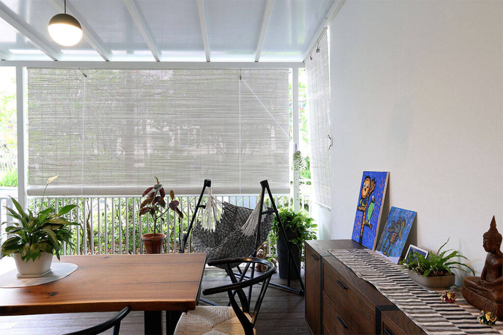 “We chose a wood decking to help mitigate the heat underfoot, and also went with wood materials overall, for the same reason,” says Xueling. A sheltered roof was extended above, and given the patio’s close proximity to the pool, the sound of water brings an added sense of tranquility to the space.