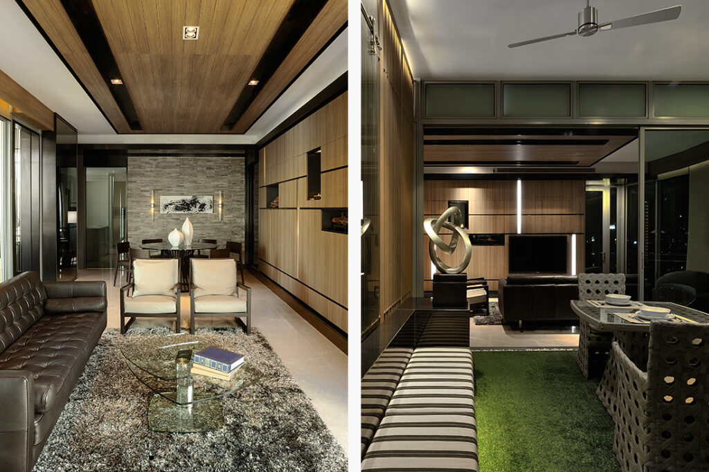 Metaphor Studio conceptualised a modern resort with Asian design elements for this home, and ensured a cosy and sophisticated ambience throughout. The living area features woodgrain laminated panelling on the ceiling that matches that of the television feature wall. A challenge of this space is its wall-to-wall windows, which take up a significant part of the usable storage space. Therefore, hidden behind this wall (top right) are extensive storage solutions, as well as a karaoke system.