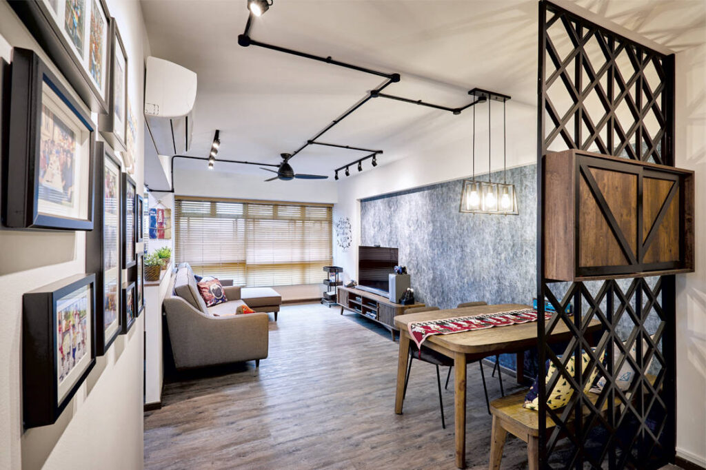 The family of three staying in this flat wanted a warm and inviting home with a decor that they describe as ‘rustic industrial’. Keeping in mind the homeowners’ need for more storage and display cases, Dots N Tots Interior designed a personality-filled abode with striking wood-look finishes and black accents that won’t go out of style.