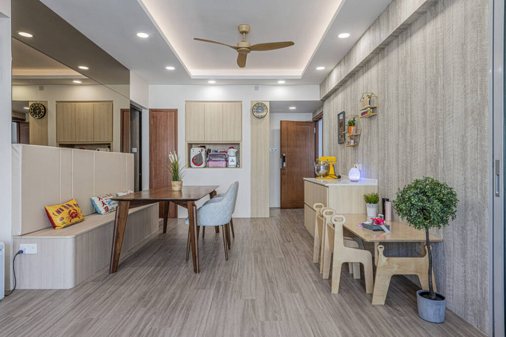 The dining area, too, holds storage solutions by way of the cabinets to one side and the customised dining bench. “Since the apartment is blessed with high ceilings, we managed to add more storage at the feature wall area,” adds the designer.
