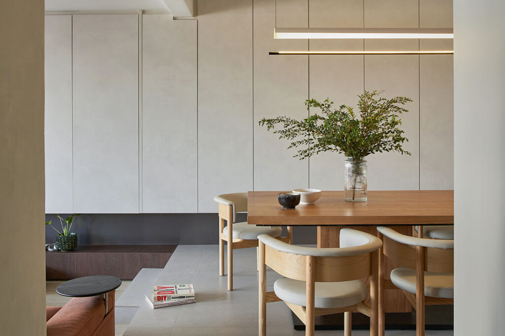 To achieve this, the design employs a restrained material palette that exudes warmth and serenity. Neutral, earthy tones have been chosen as the foundation, with natural materials like timber veneers, natural stone surfaces, and terracotta tiles. These elements contrast against the steel and glass exterior of the city, creating a tranquil atmosphere. “Our aim was to orchestrate a pared-down, restful mood, one that embodies a sense of reclusiveness and escape,” Kelvin adds.
