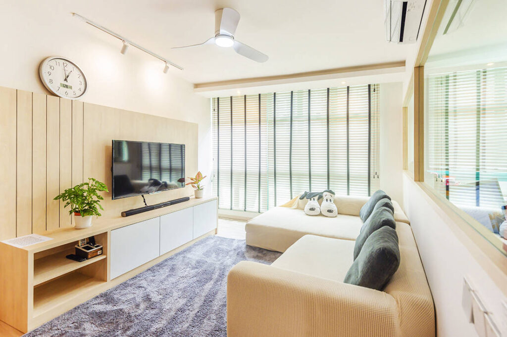 This old resale flat had slanted ceilings, uneven walls, lack of floor traps, leaking windows and damaged marble flooring. By gutting the entire flat, the design team was able to refresh the space and re-programme the layout. Vinyl flooring has been used throughout the unit, and a glass kitchen door has been fitted to encourage interaction and permit natural light to enter into the deeper recesses of the home.