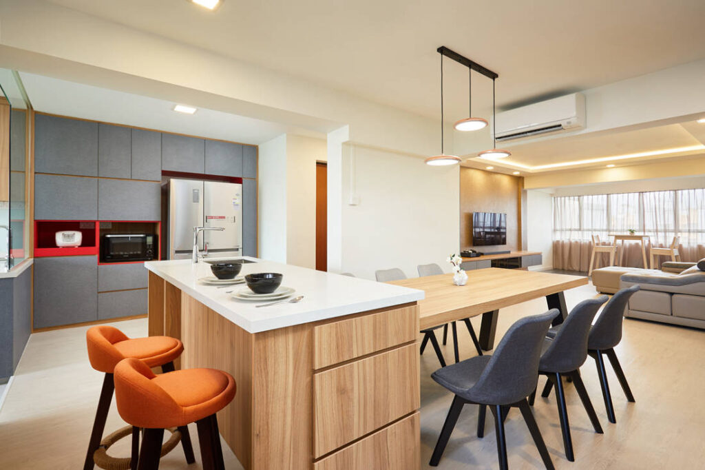 This five-room resale flat in Ang Mo Kio used to be in a dishevelled condition. But with the help of interior design firm Dots N Tots Interior, it’s now bigger, brighter and packed with modern amenities. Home to a family of four, the designers aimed to meet the requirements of each family member. At the same time, they wanted to breathe new life into the resale flat.